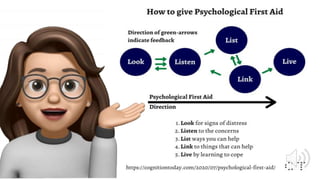 The document provides an overview of psychological first aid (PFA), detailing its purpose, signs of distress to look for, and guidelines for effectively giving support to those in need. It discusses the various crises affecting mental health during the pandemic and emphasizes the importance of community support, listening, and linking individuals to resources that can aid their recovery. PFA is framed as a crucial tool for restoring a sense of security and well-being in individuals experiencing distress.