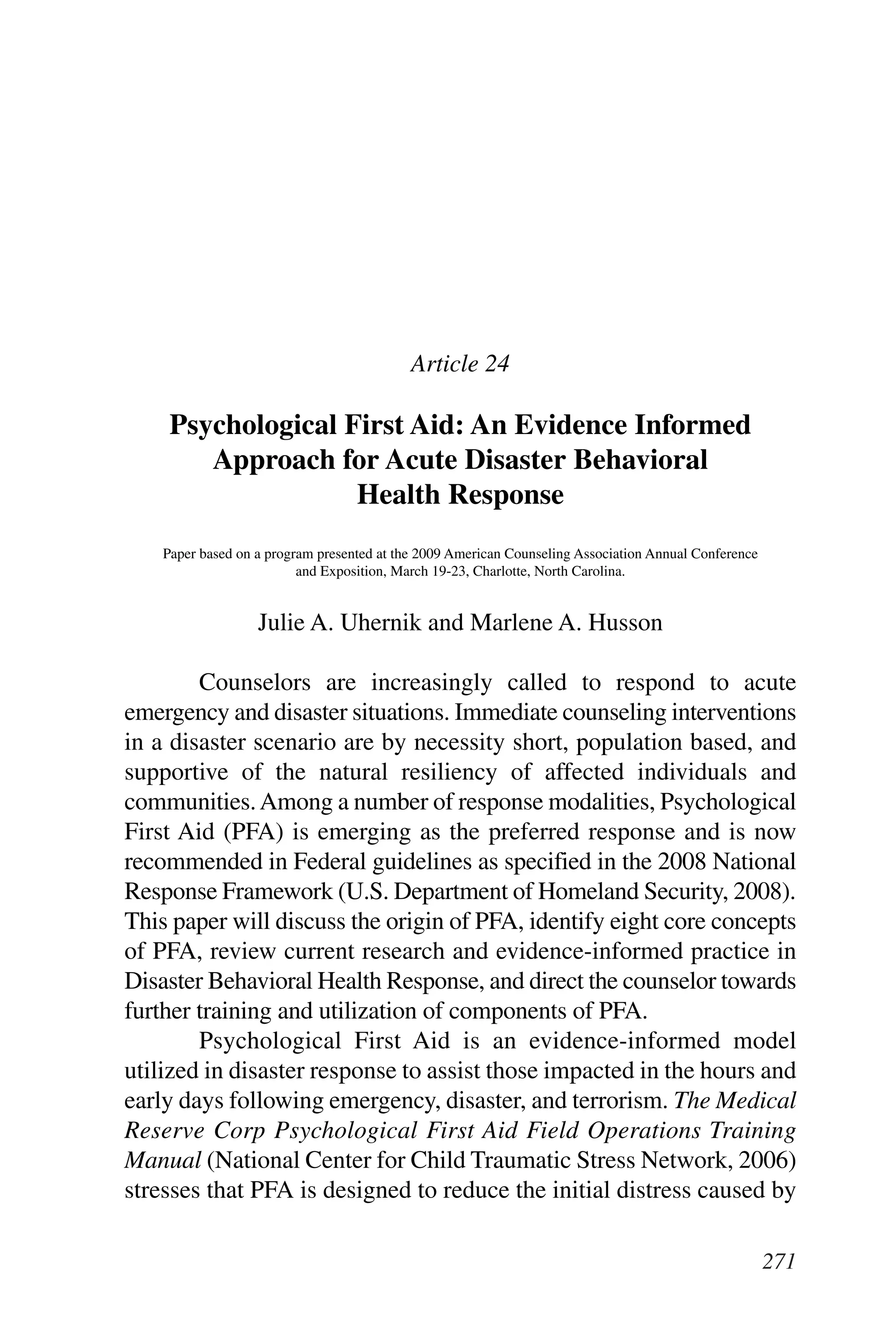 The document discusses Psychological First Aid (PFA) as an evidence-informed model for disaster behavioral health response, highlighting its effectiveness in supporting individuals impacted by trauma. PFA aims to alleviate distress and foster resilience through eight core actions, and it has garnered recognition in federal guidelines as a preferred intervention. The evolving application of PFA allows counselors to better address the needs of various populations, including children, first responders, and military families during disaster situations.