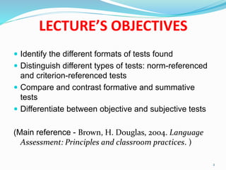 This document discusses different types of tests used in education. It begins by defining norm-referenced tests, which compare students to other test-takers, and criterion-referenced tests, which measure students against a preset standard. The document then contrasts norm-referenced and criterion-referenced tests in terms of purpose, content, item characteristics, scoring, and uses. It also discusses the advantages and disadvantages of each. Finally, the document defines formative assessment, used to improve student learning, and summative assessment, used to evaluate learning outcomes.