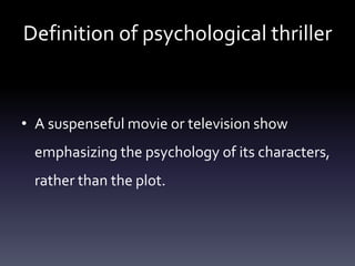 Psychological thrillers focus on the psychology of characters rather than plot, with themes of reality, perception, identity and death. Typical settings include old abandoned houses, hospitals, and forests where characters are isolated and battling their own minds. Iconography in these films, like knives, confined spaces and shadows, provide symbolic meaning and clues that psychological elements are involved. Examples given are the television shows Hannibal and Dexter, video games Heavy Rain and Alan Wake, and movies Black Swan, Shutter Island, Se7en, The Shining, and The Silence of the Lambs.