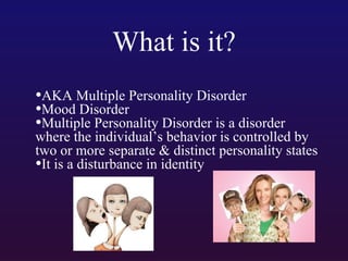Dissociative Identity Disorder (DID), also known as Multiple Personality Disorder, is a condition where a person has two or more distinct personalities or identity states that repeatedly take control of behavior. It is caused by extremely traumatic events during childhood. Symptoms include memory loss, mood swings, and altered states of consciousness where personalities emerge and change. Treatment involves psychotherapy and sometimes medication to help integrate the alternate personalities.