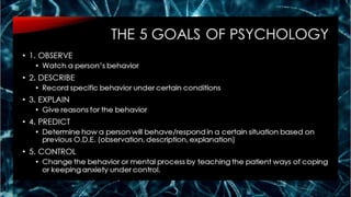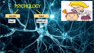 The document provides an introduction to the field of psychology. It discusses how psychology evolved from the study of the soul and mind to also include the study of behavior and conscious experience. It notes that Wilhelm Wundt is considered the father of psychology for opening the first experimental psychology lab in 1879. The document also mentions that there are different schools of thought in psychology and provides some definitions of psychology from different scholars that focus on understanding and investigating human and animal behavior.