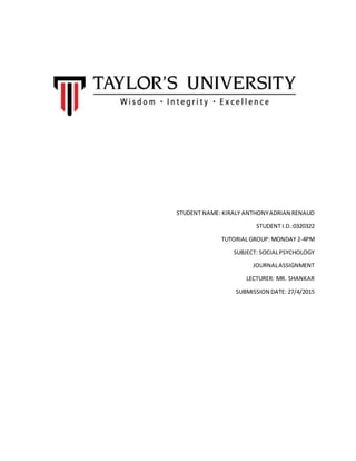 This document contains a student's journal assignment submission containing multiple entries about their self-concept, motivation, experiences in karate training, and instances involving cognitive biases like confirmation bias and self-serving bias. The student discusses developing their self-concept through fitness, learning discipline through karate, being motivated to help their brother improve, and examples of biases they and others have exhibited.