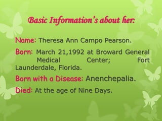 Theresa Ann Campo Pearson was born on March 21, 1992 in Fort Lauderdale, Florida with anencephaly, a birth defect where she was born without a complete brain or skull. Her parents sought to declare her brain-dead to donate her organs but courts rejected their appeals. Theresa died nine days after birth when her organs had deteriorated too much for transplant. Anencephaly occurs in about 1 in 1,000 pregnancies and babies born with this condition typically only live a few hours or days at most.