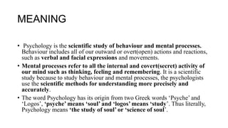 This document provides an overview of educational psychology. It defines educational psychology as the application of psychological principles to education. The goal is to understand teaching and learning processes and improve educational methods. Key topics covered include learning theories, teaching methods, motivation, development, and family relationships. Educational psychology aims to shape students' behavior and promote well-rounded personal growth through education.