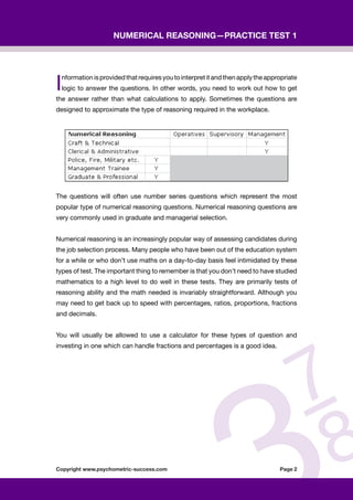 This document provides a 22 question practice test for numerical reasoning. It begins with an introduction explaining that numerical reasoning questions assess logic and reasoning skills rather than specific math skills. The test includes number series, missing number, and word problem questions. After the test, the document advertises eBooks and products to help with psychometric tests which assess abilities for various jobs. It claims these resources can help maximize performance on tests in under two weeks.
