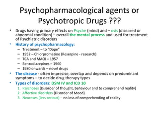 The document outlines the historical development and classification of psychopharmacological drugs for treating psychiatric disorders, detailing types of mental illnesses such as psychoses, affective disorders, and neuroses. It discusses the pharmacological properties, mechanisms of action, and side effects of various drugs including phenothiazines and butyrophenones, with a focus on their efficacy in managing symptoms of schizophrenia and mood disorders. Additionally, the text emphasizes the importance of individualized treatment approaches based on patient responses and specific symptomatology.