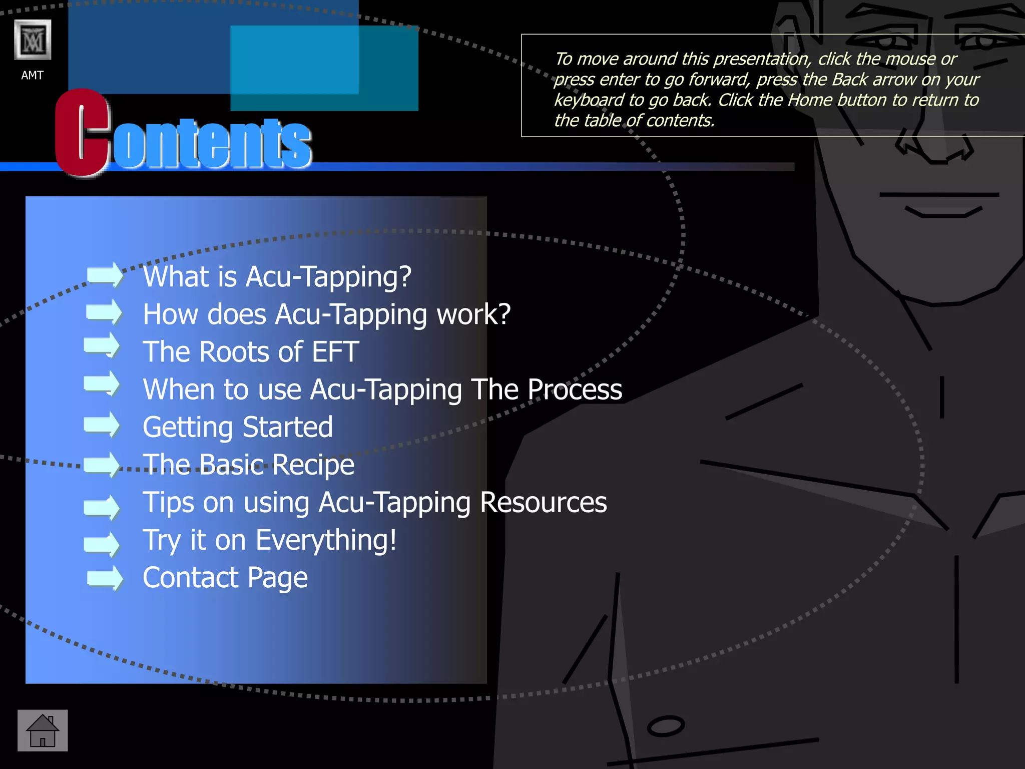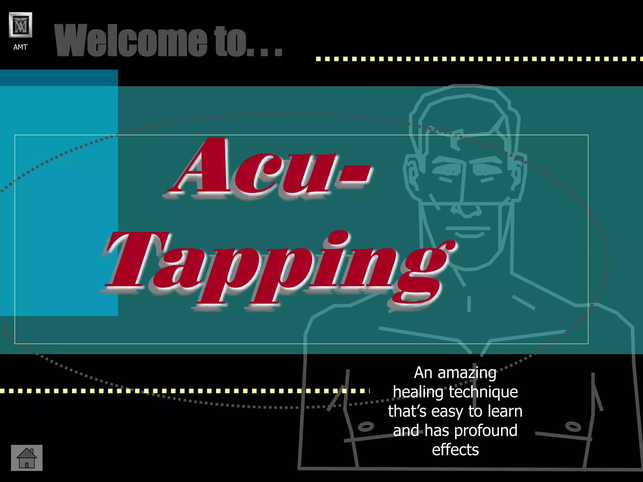 Acu-Tapping is a healing technique that uses finger tapping on acupressure points to relieve emotional and physical distress. It works by restoring balance to the body's energy system. The basic process involves tapping on various points on the face and body while focusing on the problem. This is done in rounds, rating distress before and after. Within 1-2 minutes per round, distress can reduce significantly or be eliminated altogether.
