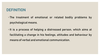 Psychotherapy is defined as the treatment of emotional or related bodily problems through psychological means such as verbal and emotional communication. The goals of psychotherapy include changing maladaptive behaviors, improving interpersonal skills, helping resolve inner conflicts, and modifying inaccurate self-assessments. Common techniques in individual psychotherapy include free association, dream analysis, hypnosis, and abreaction therapy to bring unconscious material to conscious awareness so patients can work towards resolving underlying problems.