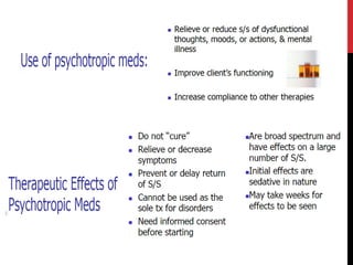 This document outlines psychotropic medications used to treat mental health conditions such as depression, bipolar disorder, and anxiety. It defines psychotropic medications as psychiatric drugs that affect brain chemistry. Common medications are discussed for each condition, along with their dosages, side effects, and nursing considerations. The document emphasizes that pregnant and breastfeeding women should discuss risks and benefits of psychotropic medication with their doctors, as limited research exists on effects during pregnancy and breastfeeding.