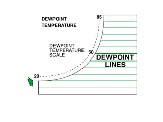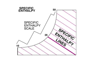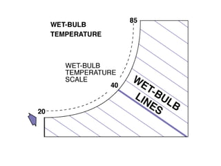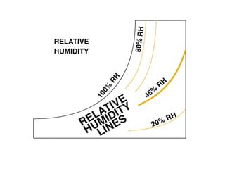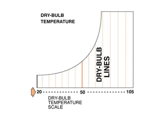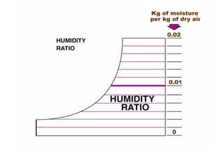 The document discusses the psychrometric chart and various psychrometric processes involving moist air. It begins by identifying parts of the psychrometric chart and explaining how it can be used to determine moist air properties and analyze processes involving moist air. Several examples are then provided to illustrate key psychrometric processes including sensible heating/cooling, heating and humidifying, cooling and dehumidifying, adiabatic or evaporative cooling, and adiabatic mixing of moist air streams. Step-by-step workings are shown for each example to determine various moist air properties and mass transfer rates.