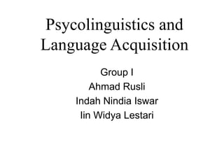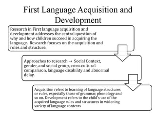 Research on first language acquisition focuses on how and why children succeed in learning language. It examines the acquisition of rules and structures through approaches like social context comparisons and studies of language disabilities. Acquisition refers to learning language rules while development refers to using rules across contexts. The CHILDES database is a collection of child language corpora accumulated by researchers. When working with children, researchers must consider their shorter attention spans, curiosity about equipment, and need to build relationships and get permission. Common research topics examine longitudinal case studies, pre-linguistic development, lexical and semantic development, phonology, comprehension, metalinguistic awareness, color terms, and sources of variation.