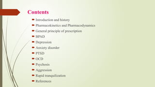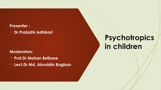 The document discusses the use of psychotropic medications in children, addressing their history, pharmacokinetics, pharmacodynamics, and prescribing principles for various mental health conditions. It outlines the differences in medication effects between children and adults and provides guidelines for treating conditions such as bipolar disorder, depression, anxiety disorders, PTSD, and OCD. Recommendations emphasize the careful selection and monitoring of medications due to the distinct developmental factors in pediatric populations.