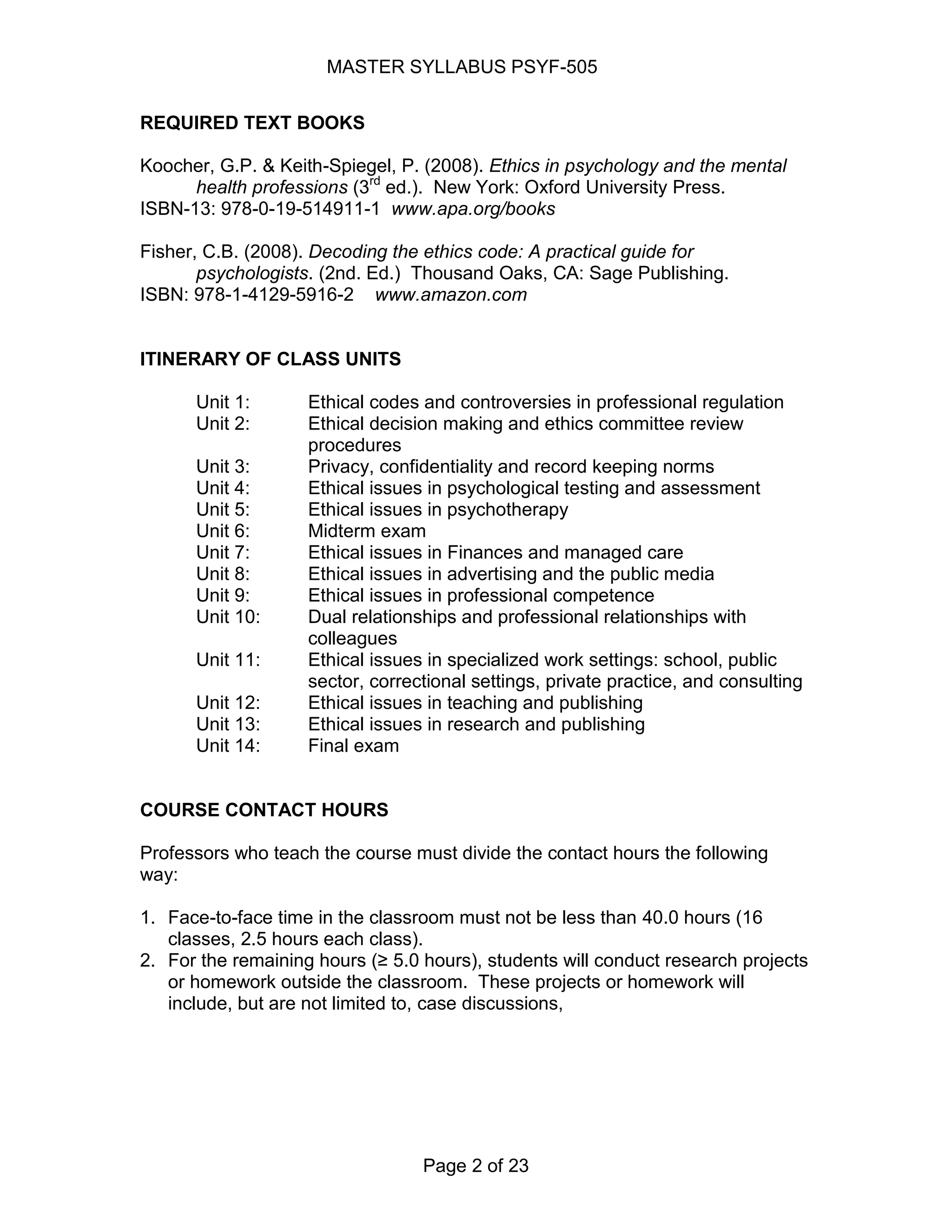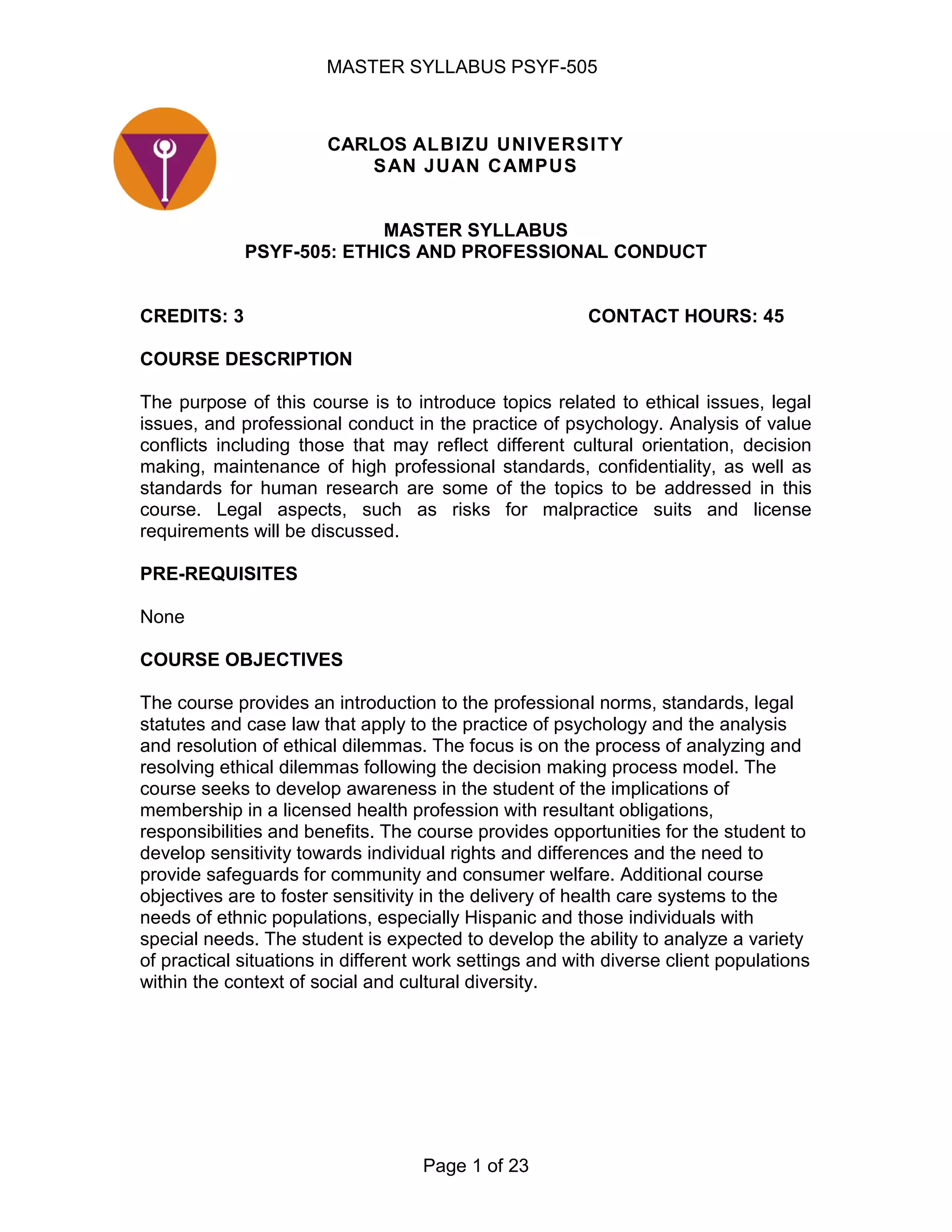 This document provides a course syllabus for an ethics and professional conduct course in psychology. The 3-credit, 45-hour course introduces topics related to ethical issues, legal issues, and professional conduct in the practice of psychology. It addresses issues like value conflicts, decision making, maintaining high standards, confidentiality, research ethics, and legal aspects like malpractice and licensing. The syllabus outlines 14 class units that will be covered over the semester, required textbooks, evaluation methods, and policies on attendance and accommodating students with disabilities.