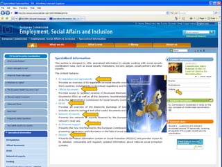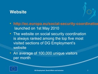 The document summarizes communication and information activities by the European Commission around modernized EU social security coordination, including launching a website on the topic that receives 100,000 monthly unique visitors, publishing 157,000 copies of publications in 22 languages, and conducting an awareness campaign targeting citizens who work or retire abroad and institutions that provide information to mobile citizens.