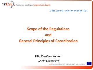 This document summarizes the scope and general principles of coordination under EU Regulations 883/2004 and 987/2009. It discusses the personal scope, which broadly includes EU citizens and their family members who are subject to social security legislation in one or more EU countries. It also examines the material scope, which primarily covers social security benefits but excludes social assistance. Key coordination principles are then outlined, including determining applicable legislation, equal treatment, assimilation of facts, aggregation of periods, export of benefits, and administrative cooperation between member state institutions.