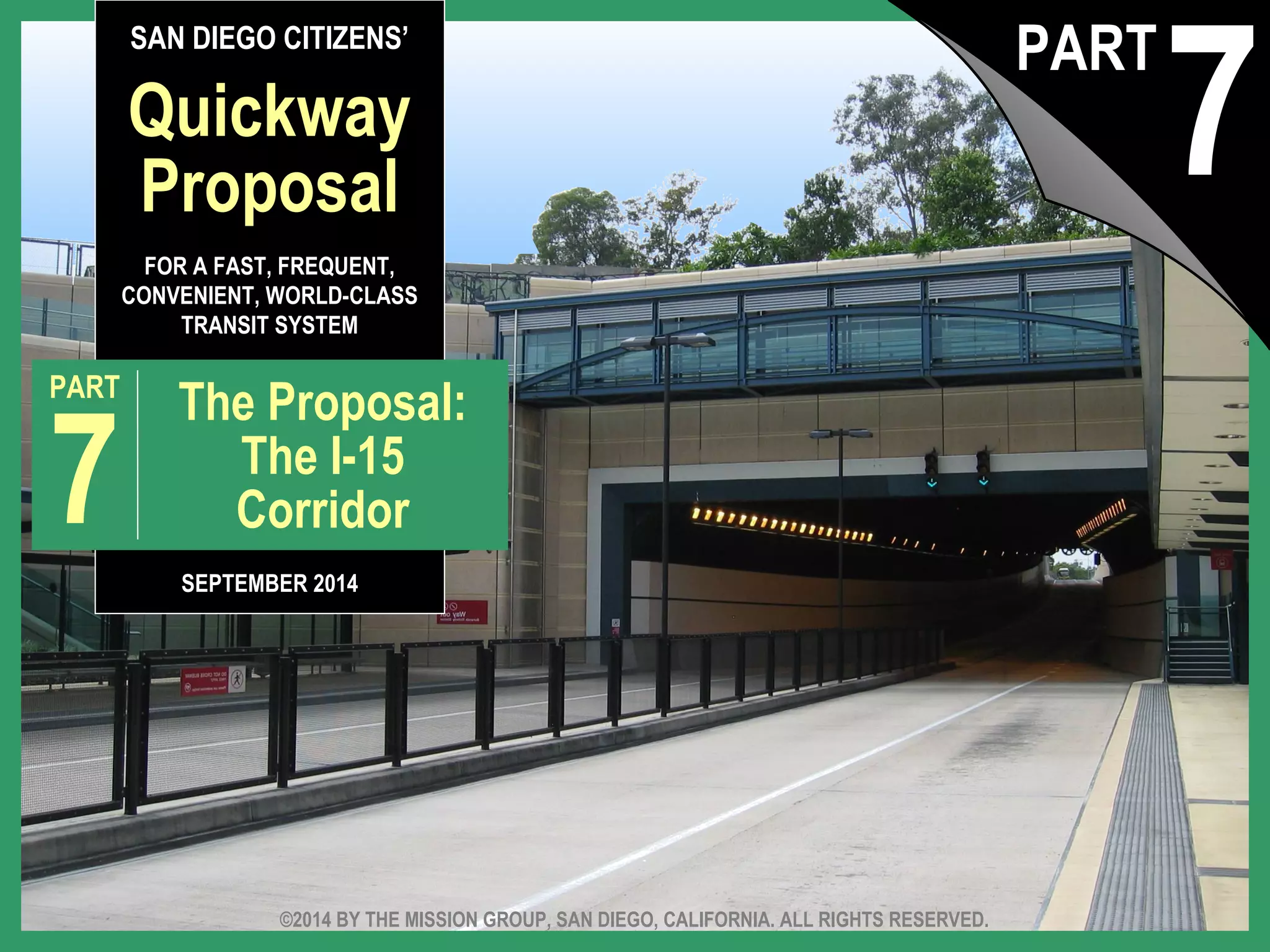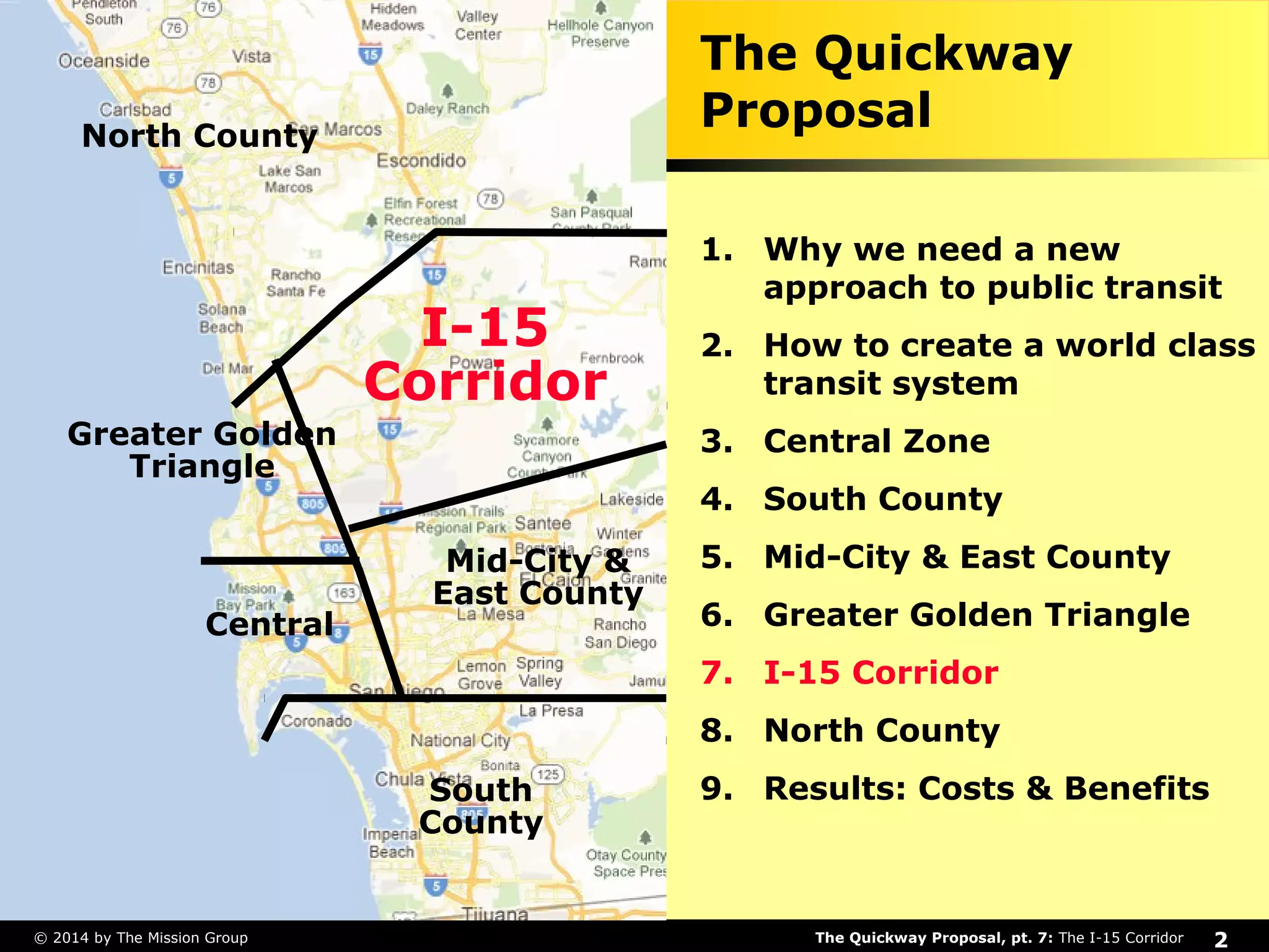 This document proposes a transit system for the I-15 corridor in San Diego County. It would include a grade-separated quickway, arterial transitways, and passenger-friendly stations. Core routes and MetroXpress routes would operate along the corridor, with the MetroXpress providing express service between major destinations like Mira Mesa, Rancho Bernardo, and the airport, while stopping primarily at superstations. The proposal aims to create a world-class rapid transit system but notes that elements may need redesign due to construction changes.