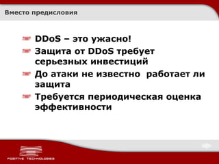 Документ обсуждает важность комплексной защиты от атак DDoS, подчеркивая необходимость инвестиций и регулярной оценки эффективности систем безопасности. Описываются методы анализа, включая нагрузочные тесты и оценку уязвимости сетевой инфраструктуры и приложений. Приводятся рекомендации по реагированию на атаки и улучшению защиты через разнообразные подходы и практические методы.