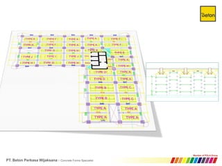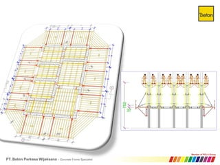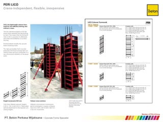 This document proposes using PERI formwork systems for the Medan Centre Point apartment construction project. It recommends using the PERI Vario GT24 system for columns and core walls. The GT24 girder can be used for both vertical and horizontal formwork and offers benefits like flexibility, strength, and cost effectiveness. It also recommends using the PERI Lico system and PERI UP Rosset system for slab beams, shoring, scaffolding, and stairs. PT Beton Perkasa Wijaksana will assemble wall panels off-site to ensure accuracy.