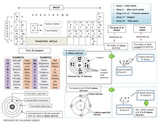 1. The document discusses the periodic table and provides details about various groups of elements. It describes the physical and chemical properties of Group 1 alkali metals, Group 17 halogens, transition elements, and Group 18 noble gases.