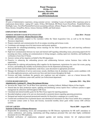Penni Thompson has over 20 years of administrative experience including positions at the Federal Reserve Bank of Kansas City, United Blood Services, City of Lawton, and Texas Tech University Health Sciences Center. Her experience includes providing administrative support, coordinating travel, handling calendars and meetings, entering data, and assisting in legal and HR functions. She has strong skills in Microsoft Office, accounting software, and various other systems. Professional references are available upon request.
