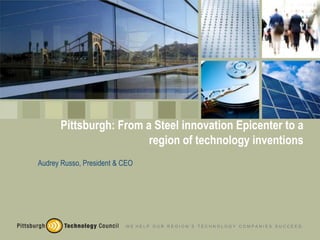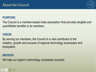 The Pittsburgh Technology Council is a nonprofit trade association that serves over 1,400 technology companies in southwestern Pennsylvania, with a focus on information technology, life sciences, advanced manufacturing, and green technology. The Council provides business development support, helps companies attract talent, increases visibility and exposure for members, and advocates for technology-friendly public policy. Its goal is to help regional technology companies succeed and contribute to the area's economic growth.
