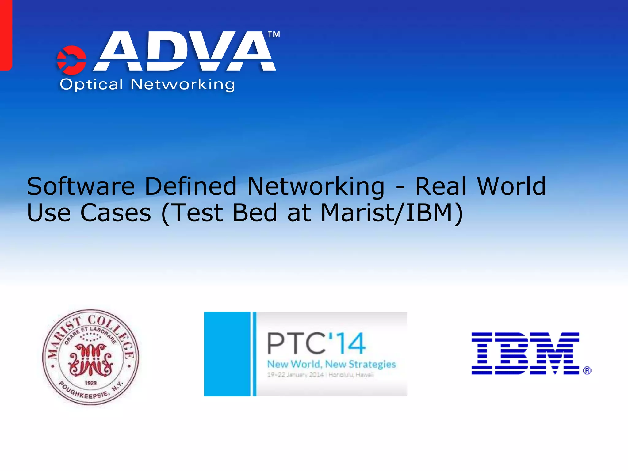This document discusses a test bed for software defined networking (SDN) and dynamic infrastructure provisioning created by Marist College and IBM using equipment from ADVA Optical Networking. The test bed allows dynamically provisioning bandwidth between different sites based on varying traffic needs over time through open interfaces that allow an SDN controller to program the optical network. A live demo is planned to demonstrate the dynamic provisioning capabilities of the test bed.