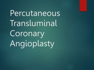 Percutaneous transluminal coronary angioplasty (PTCA) is a minimally invasive procedure used to open blocked coronary arteries and restore blood flow to the heart. During PTCA, a catheter with a deflated balloon at the tip is inserted into the blocked artery and inflated to compress the plaque and widen the artery. Stents may be placed to help keep the artery open. The procedure aims to improve blood supply and relieve symptoms caused by coronary artery disease.