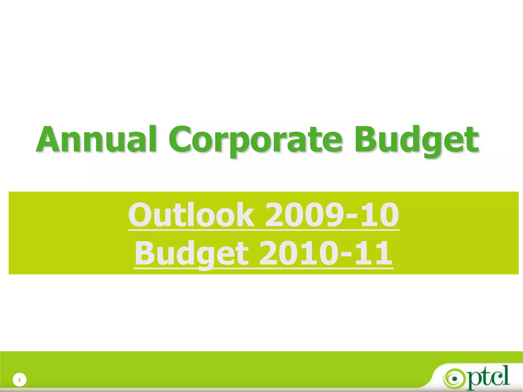 The annual corporate budget document outlines the company's outlook and budget for 2009-2010. It projects lower revenue and customers compared to previous years but higher blended ARPU. Key highlights include projected declines in gross revenue, net revenue, and operating profit but increases in EBITDA margin and PAT. The budget also forecasts increases in capital expenditures and headcount while operating expenses are projected to decrease.