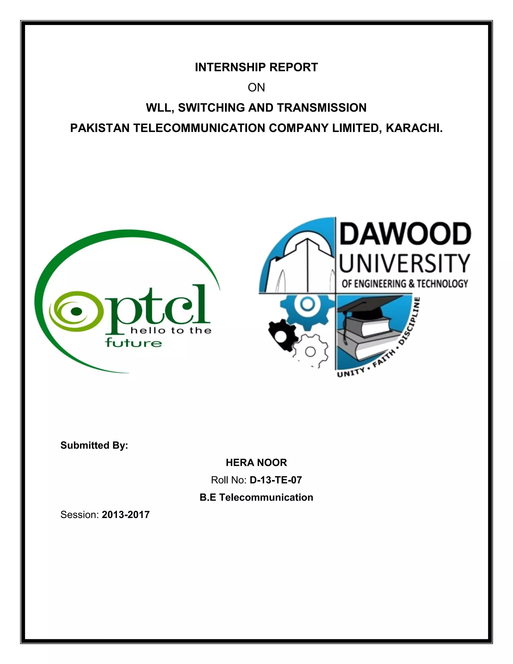 The document provides an internship report on WLL, Switching and Transmission at Pakistan Telecommunication Company Limited (PTCL) in Karachi.