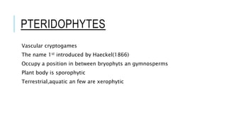 1. Sphenopsida includes the living genus Equisetum and related extinct genera. They attained their maximum development in the Carboniferous period but are now nearly extinct except for Equisetum.