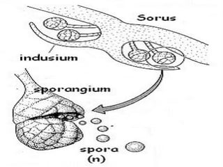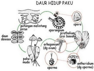 Dokumen ini menjelaskan tentang tumbuhan paku, termasuk struktur, fungsi, dan klasifikasinya. Tumbuhan paku merupakan kormofita rendah yang hidup di lingkungan lembab dan berkembang biak secara generatif maupun vegetatif. Mereka juga memiliki peran penting dalam kehidupan manusia sebagai tanaman hias, sumber obat-obatan, dan bahan pangan.