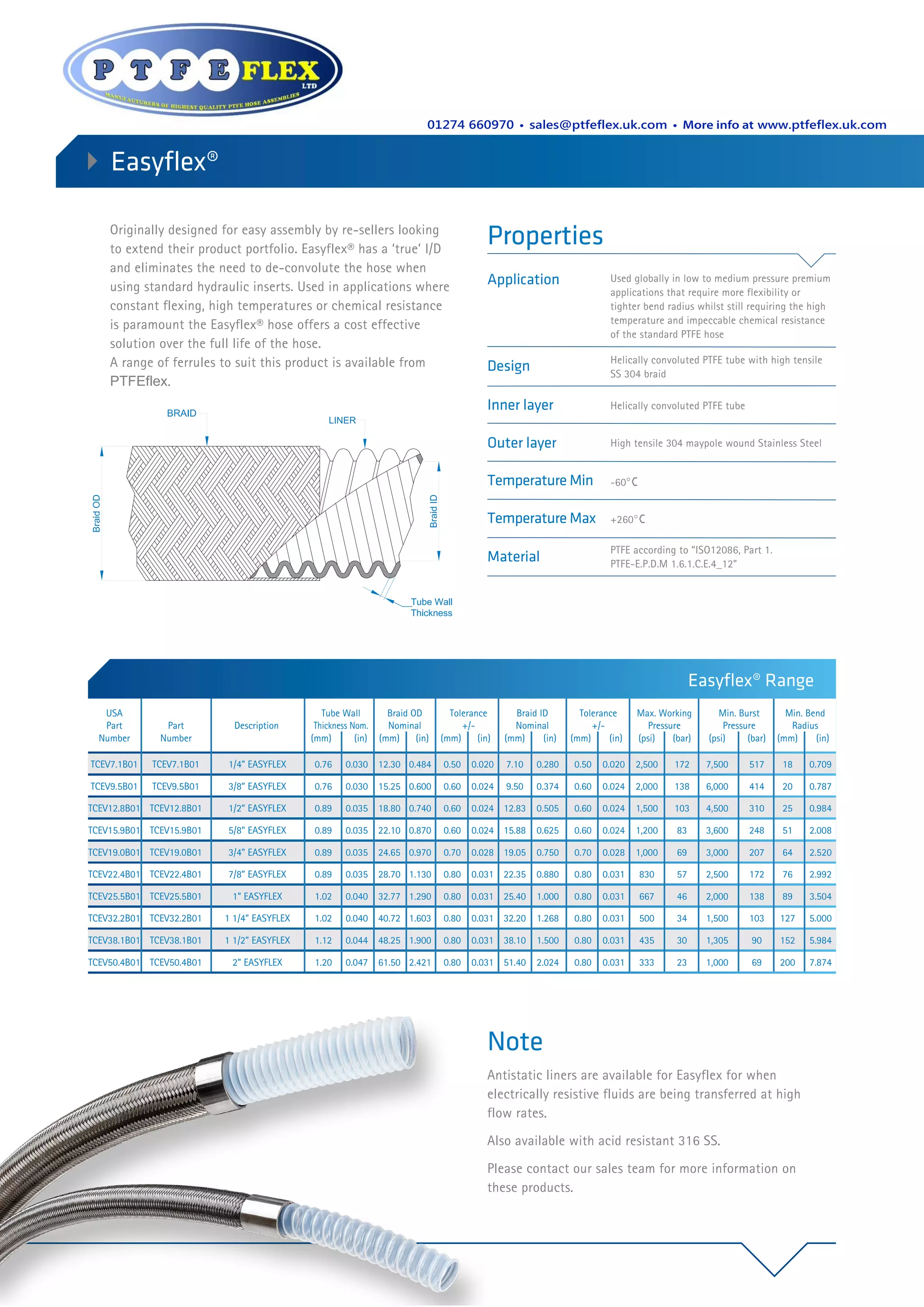 Easyflex is a PTFE hose designed for flexibility and resistance to heat and chemicals. It has an inner and outer layer of helically convoluted PTFE tube reinforced with a stainless steel braid. It can operate between -60 and +260 degrees Celsius and is used globally for low to medium pressure applications that require flexibility or tight bend radii. Antistatic liners and an acid resistant 316 SS option are available.