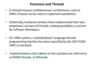 This document provides an introduction to POSIX threads (Pthreads) programming. It discusses what threads are, how they differ from processes, and how Pthreads provide a standardized threading interface for UNIX systems. The key benefits of Pthreads for parallel programming are improved performance from overlapping CPU and I/O work and priority-based scheduling. Pthreads are well-suited for applications that can break work into independent tasks or respond to asynchronous events. The document outlines common threading models and emphasizes that programmers are responsible for synchronizing access to shared memory in multithreaded programs.