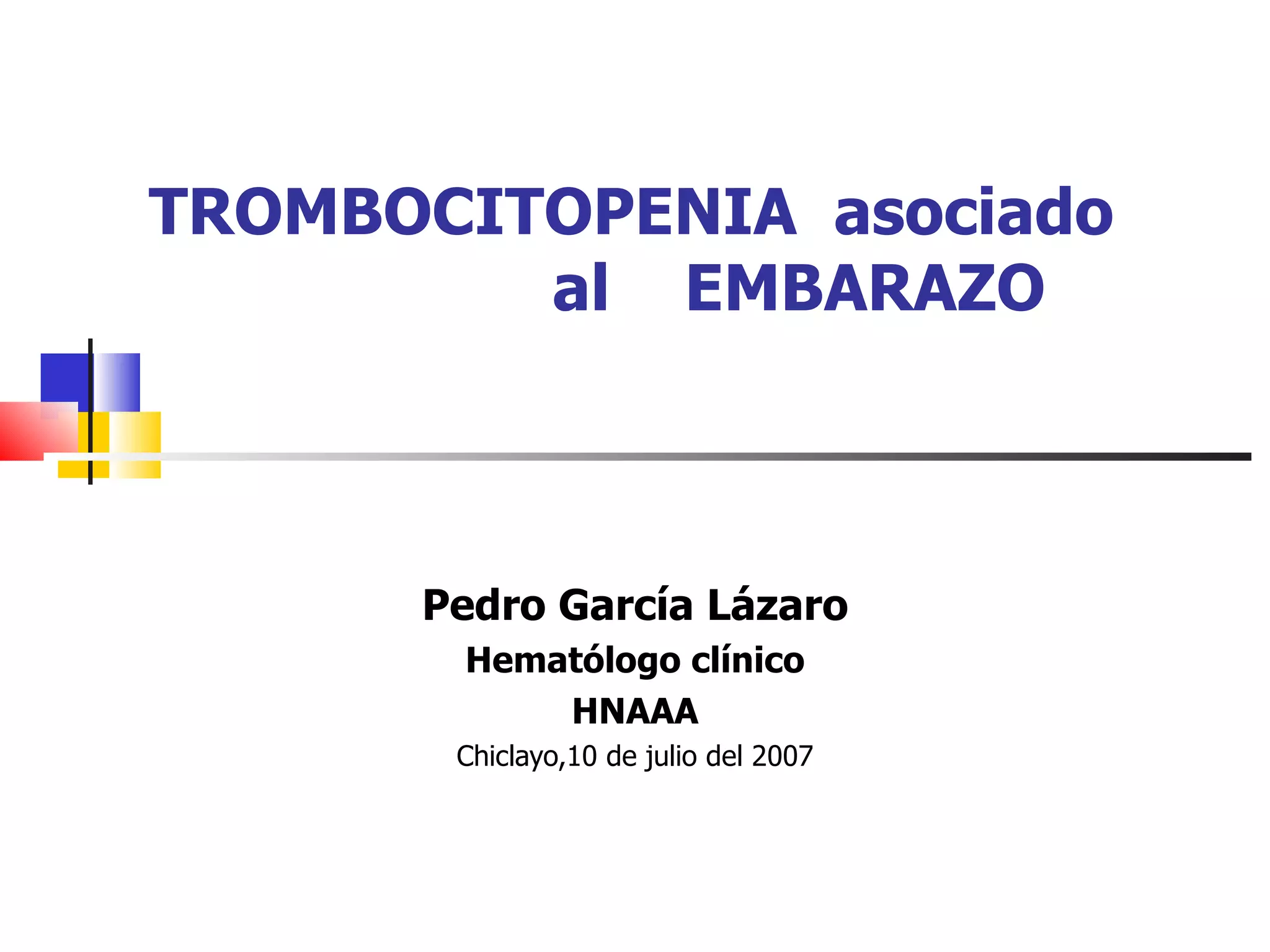 The document discusses thrombocytopenia associated with pregnancy. It notes that thrombocytopenia commonly occurs in the third trimester of pregnancy and affects around 7% of pregnancies. Thrombocytopenia can be isolated, immune-mediated (idiopathic thrombocytopenic purpura), drug-induced, or associated with other systemic disorders like preeclampsia. Diagnosis involves blood tests and ruling out other potential causes. Treatment depends on platelet count and severity but may involve corticosteroids, IVIG, or splenectomy in severe cases. Risk of bleeding in infants is generally low but platelet counts should be monitored.