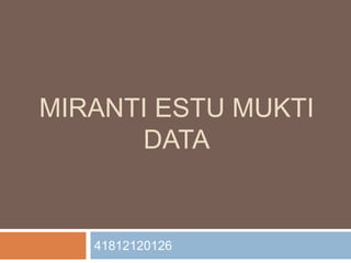 Dokumen menjelaskan pengertian data dan informasi, serta klasifikasi data menjadi karakter dan numerik. Ia juga menguraikan sistem biner, hirarki data, dan komponen sistem basis data yang terdiri dari hardware, software, dan pengguna. Manfaat penyusunan database termasuk mengurangi redundansi, memudahkan akses data, dan meningkatkan keamanan data.