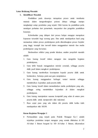 Dokumen ini membahas tentang praktik mengajar di SD Al-Azhar I Batam dan mengidentifikasi masalah yang dihadapi, seperti kurangnya kreativitas guru dan keaktifan siswa. Setiap kasus praktik mengajar mencakup analisis penyebab masalah, tindakan yang diambil, serta hasil tindakan untuk meningkatkan proses pembelajaran. Kesimpulannya, terdapat peningkatan kualitas pembelajaran setelah menerapkan solusi terhadap kendala yang ada.