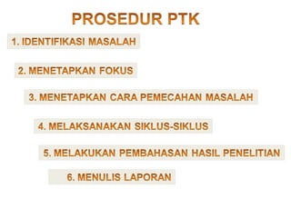 Dokumen ini membahas penelitian untuk meningkatkan mutu pembelajaran dan prestasi siswa melalui tindakan yang terstruktur, mencakup langkah-langkah seperti perencanaan, pelaksanaan, observasi, dan refleksi. Penelitian ini bertujuan untuk mengidentifikasi masalah dan merumuskan solusi melalui model, strategi, dan teknik pengajaran yang sesuai. Hasil akhirnya diharapkan dapat meningkatkan kualitas pendidikan baik dalam proses maupun produk pembelajaran.
