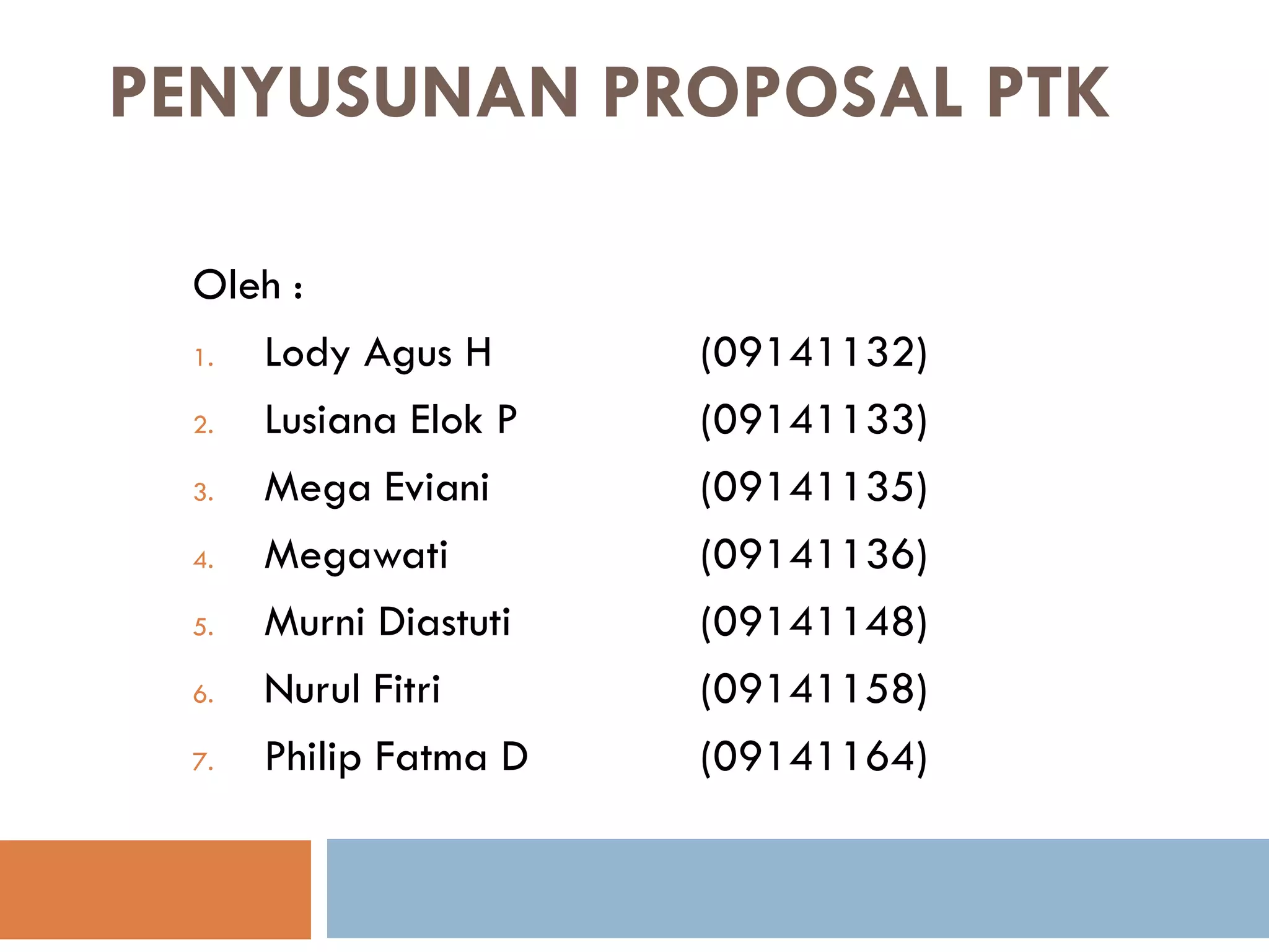 Dokumen ini membahas langkah-langkah penyusunan proposal Penelitian Tindakan Kelas (PTK) oleh sekelompok peneliti. Proposal mencakup elemen penting seperti judul penelitian, latar belakang masalah, rumusan masalah, tujuan penelitian, manfaat penelitian, kajian pustaka, hipotesis tindakan, dan metode serta teknik pengumpulan data. Dokumen ini juga menjelaskan struktur siklus penelitian dan analisis data yang diperlukan dalam penelitian tersebut.