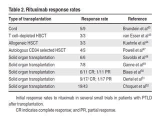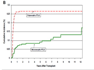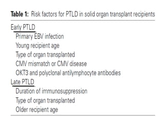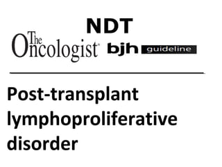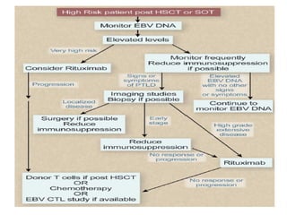 Post-transplant lymphoproliferative disorder (PTLD) is a lymphoid proliferation that occurs after solid organ or stem cell transplantation due to immunosuppression. It is caused by Epstein-Barr virus (EBV) infection in B cells that is normally kept in check by cytotoxic T cells. PTLD ranges from benign early lesions to malignant monoclonal B cell proliferations and has an incidence of around 10% in solid organ transplant recipients. Diagnosis involves evaluating EBV viral load, imaging, and biopsy to detect EBV infection and lymphoid proliferation. Treatment depends on disease severity and includes reducing immunosuppression, antiviral drugs, surgery, rituximab, chemotherapy, and