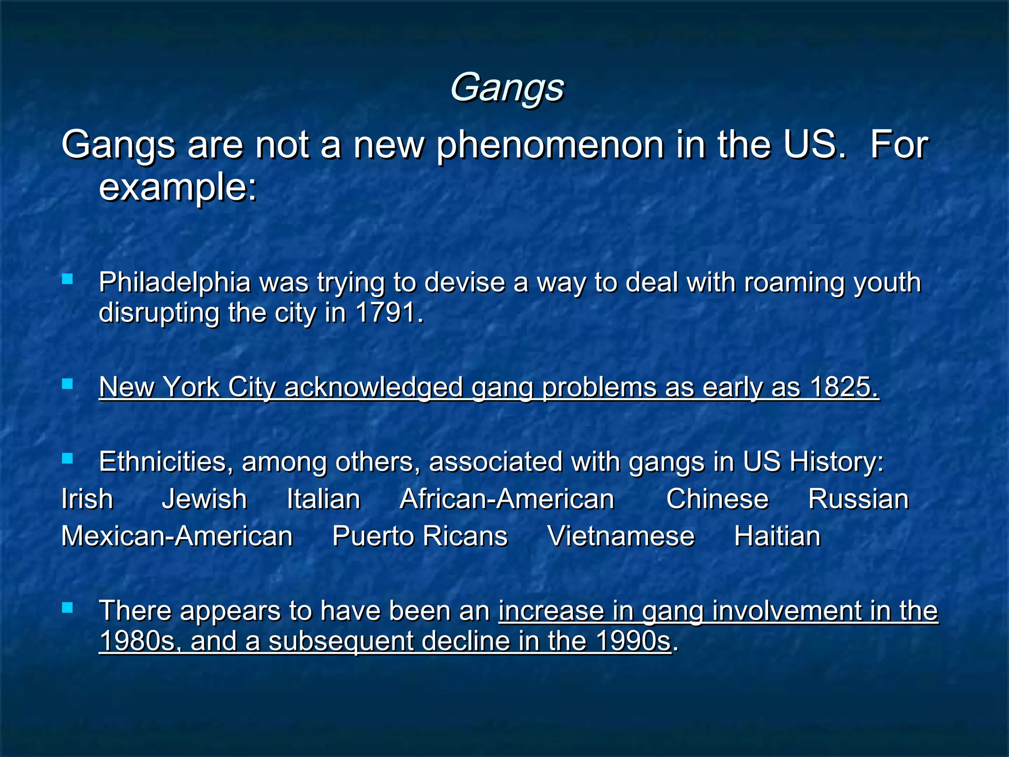 Gangs have existed in the US for many decades. While gang involvement increased in the late 1980s and early 1990s, numbers started declining in the late 1990s. Gangs are typically made up of young males seeking belonging, protection, and status. Like other groups, gangs form due to human desires for psychological and resource security through emotional bonds. While criminal activities are concerning, gangs fulfill normal human needs similarly to other organizations through features such as colors, initiation, hierarchy, and recruitment. Effective prevention focuses on strengthening communities and families to reduce the attractiveness of gang involvement.