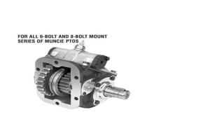 The power take-off (PTO) system transfers power from a vehicle's engine to auxiliary equipment through intermeshing gears, allowing the equipment to be powered by the engine. It converts the engine's power by changing the torque, speed, and direction of rotation to suit the needs of the attached equipment.