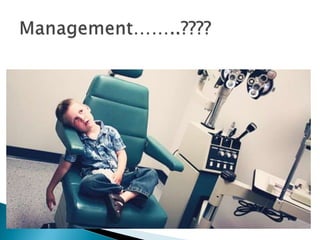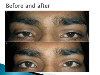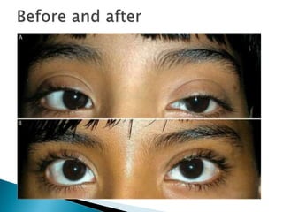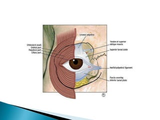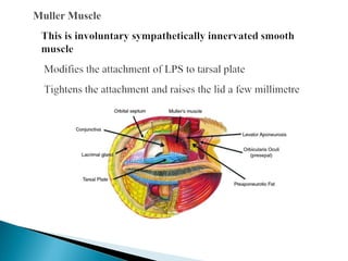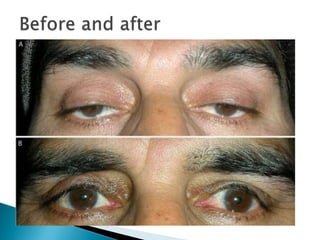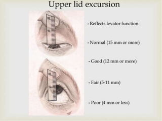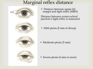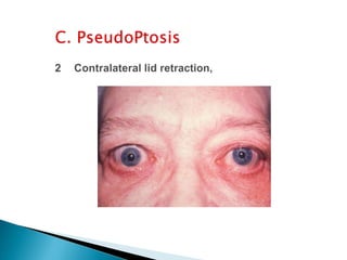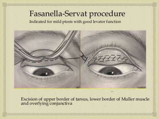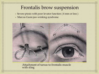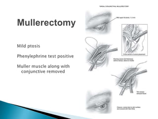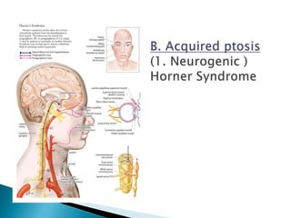 The document discusses ptosis, a condition characterized by the drooping of the upper eyelid, detailing its definition, classifications, clinical features, diagnostic methods, and treatment options. It includes congenital types, neurogenic and myogenic forms, and management strategies ranging from non-surgical interventions to various surgical techniques. Diagnosis relies on a thorough assessment of eyelid position, muscle function, and associated ocular anomalies.