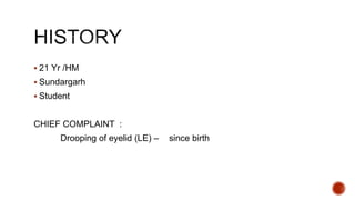 This document summarizes a medical case of a 21-year-old male student who was born with drooping of his left eyelid. Upon examination, the doctor notes that the patient has unilateral drooping of the left eyelid since birth with no double vision or other symptoms. Various tests were performed including visual acuity tests and eyelid measurements, which confirmed ptosis, or drooping, of the left upper eyelid since birth with normal function and vision in both eyes otherwise. The doctor's assessment is that the patient has a simple congenital ptosis, or drooping eyelid, of the left eye.
