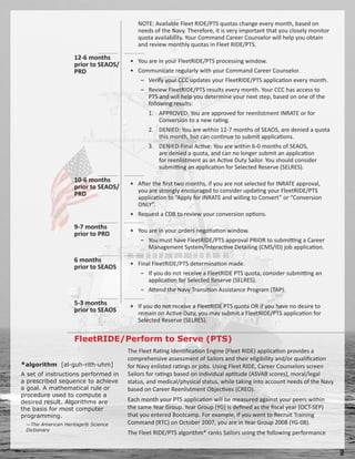 The document provides information about the Perform to Serve (PTS) program, which uses an algorithm to rank sailors based on performance indicators like pay grade, evaluation rankings, and Navy Enlisted Classification codes. It outlines the timeline sailors should follow, starting 24-15 months before their end of active service, to submit PTS applications, check eligibility results each month, and make career decisions. The key performance factors considered by the PTS algorithm when ranking applications are highest pay grade, evaluation rankings, critical ratings, and aptitude test scores.