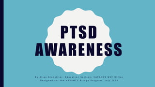 The document outlines a PTSD awareness program aimed at educating employees about the definition, symptoms, treatment, and historical context of post-traumatic stress disorder. It emphasizes the importance of treating veterans and their families with respect and courtesy while recognizing that PTSD can manifest in various ways, particularly under stress. The content also includes historical references to PTSD, illustrating its long-standing presence and the associated challenges faced by those affected.