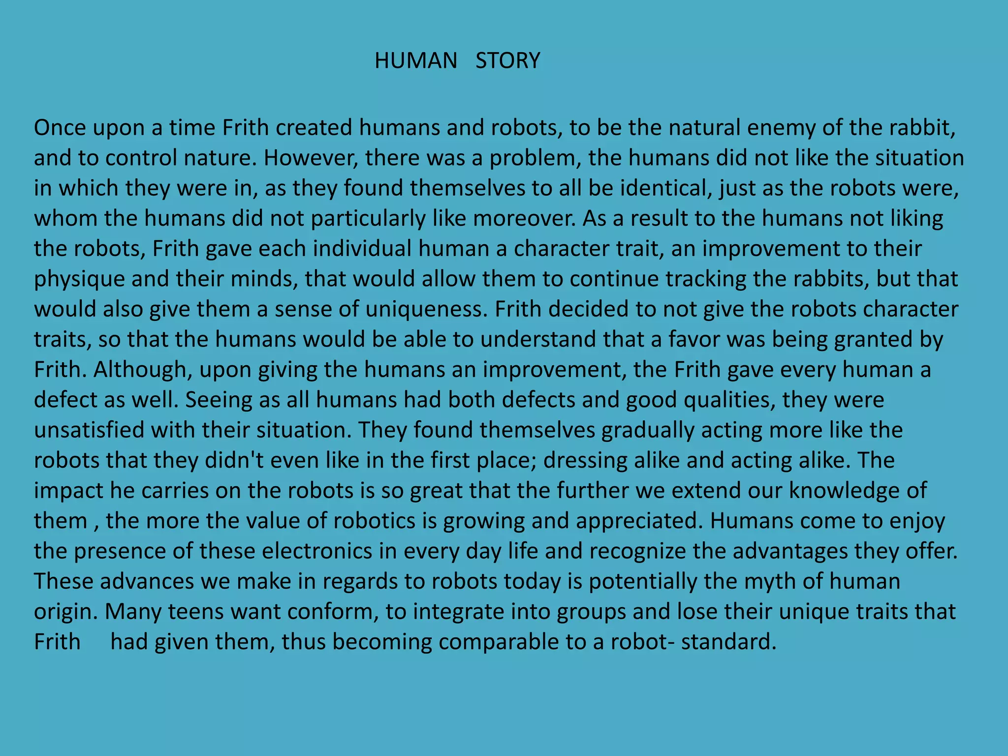 Frith created humans and robots to control nature, but the humans disliked being identical and the robots. To please the humans, Frith gave each one a unique character trait and physique. However, Frith also gave each human a defect. Though now distinct, the humans were still unsatisfied and gradually began conforming to each other, dressing and acting alike and losing their individual traits, becoming similar to the standardized robots.