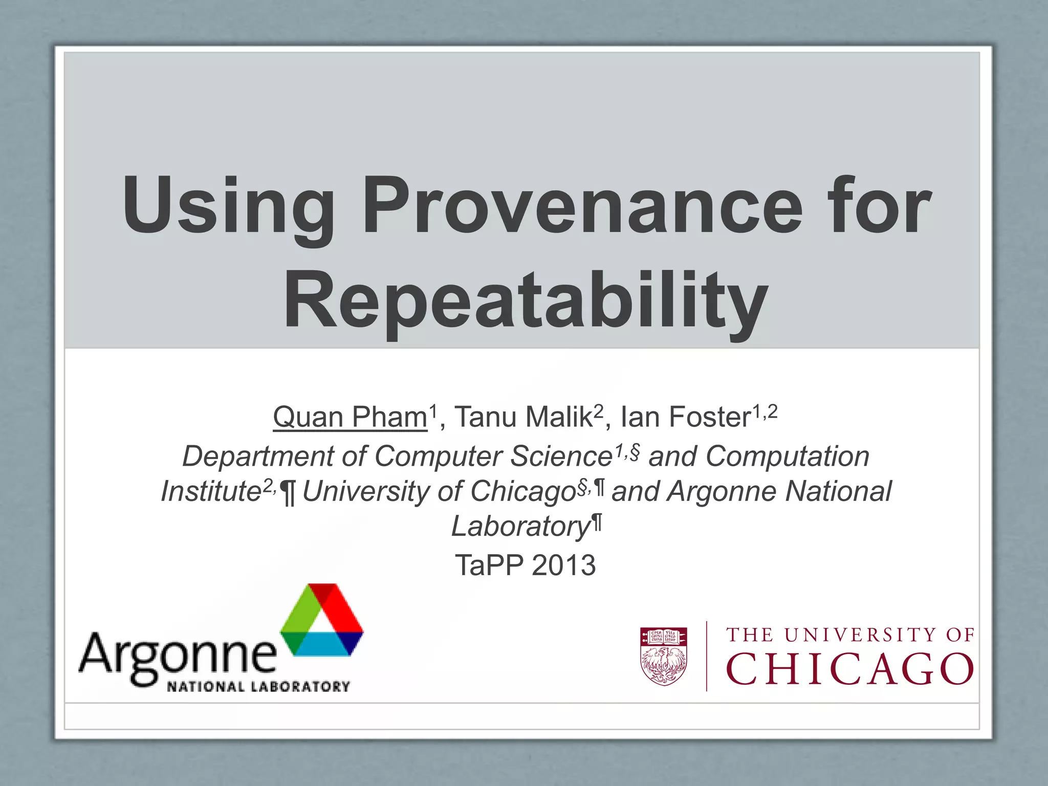This document proposes an approach called PTU (Provenance-To-Use) to improve the repeatability of scientific experiments by minimizing computation time during repeatability testing. PTU builds a package containing the software, input data, and provenance trace from a reference execution. Testers can then selectively replay parts of the provenance graph using the ptu-exec tool, reducing testing time compared to full re-execution. The document describes the PTU components, including tools for auditing reference runs, building provenance packages, and selectively replaying parts of the provenance graph. Examples applying PTU to the PEEL0 and TextAnalyzer applications show reductions in testing time.