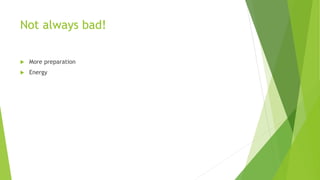 This document discusses ways to deal with and diminish the negative effects of anxiety. It suggests focusing on the argument rather than the speaker to practice depersonalization. Behavior modification techniques are also presented, such as deep breathing and starting with a familiar subject, to help overcome anxiety. Signs of anxiety like fidgeting, trembling, and forgetting are listed. Regular practice such as speaking aloud is recommended to improve dealing with anxiety.