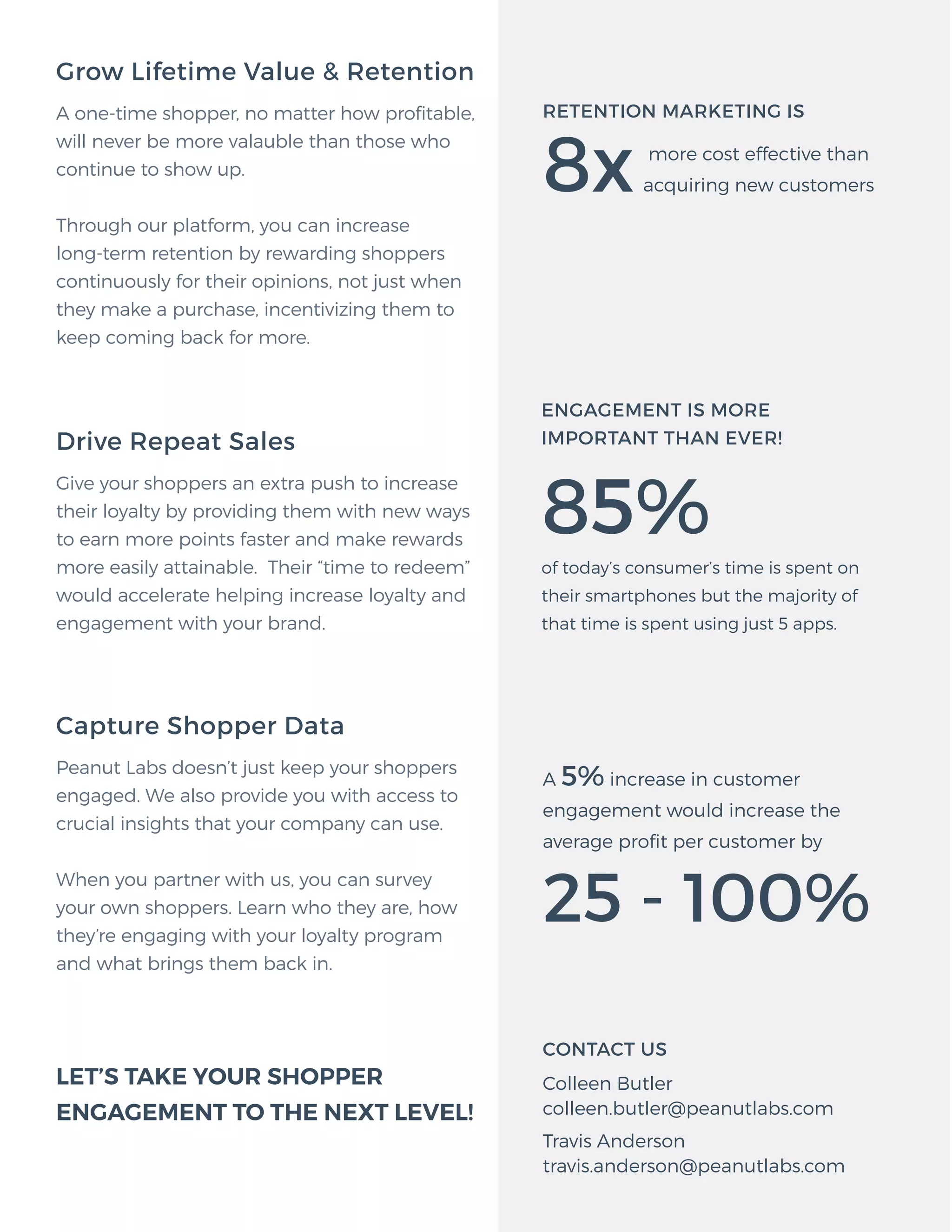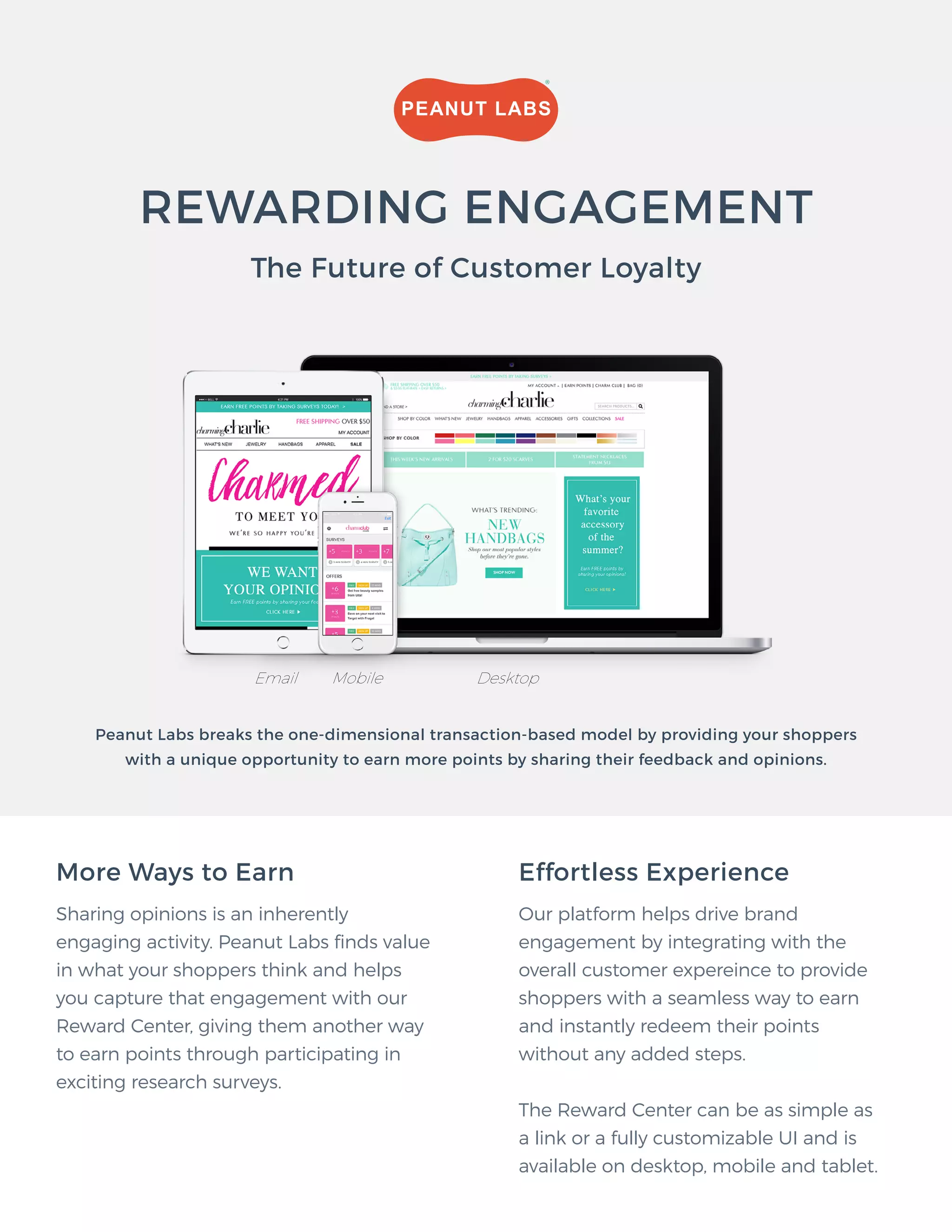 Peanut Labs' Reward Center allows shoppers to earn points by participating in surveys about their opinions and experiences. This gives shoppers another way to earn points and drives brand engagement. The Reward Center can be customized and is available across devices. It provides a seamless way for shoppers to earn points and instantly redeem them without extra steps. This breaks from the transaction-based loyalty model and rewards continuous engagement through opinions, incentivizing repeat purchases and long-term retention.